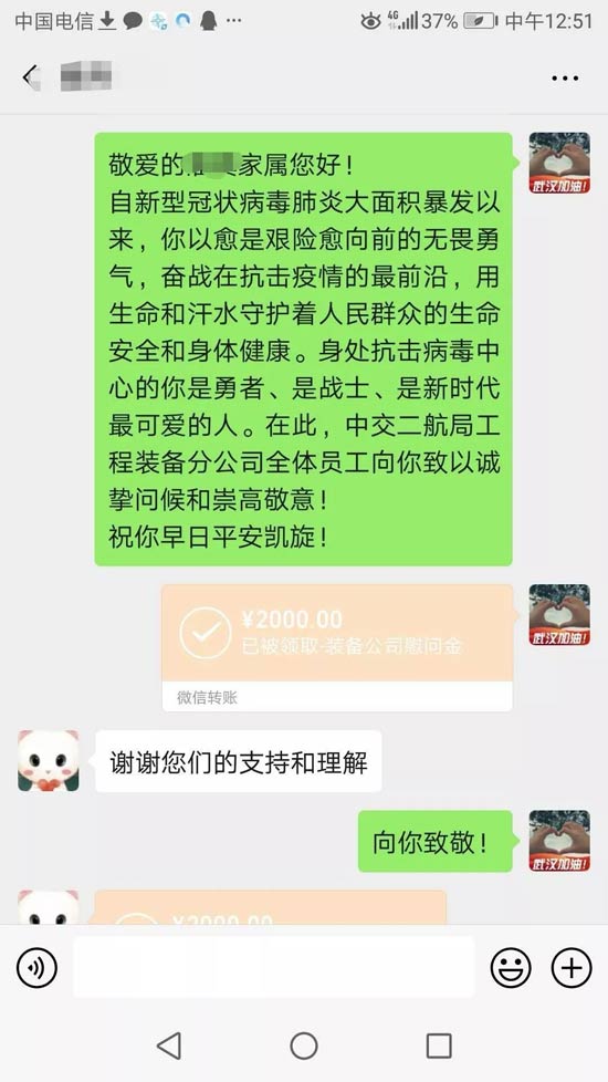 2月7日晚,一名在汉员工及家属疑似感染新型肺炎,装备分公司立即向中交二航局党委报告,二航局党委高度重视,立即指定一名在汉的装备分公司领导牵头进行一对一帮扶,通过对该员工及家属进行心理疏导,讲解防控和康复知识,细心了解职工当前的困难,及时发放慰问金,协助在武汉市疫情救助官方平台寻求医疗救助,查找汉口片区医疗资源相对充裕的医院进行门诊输液治疗等方式提供帮扶,使该职工及家属不再恐慌,重新树立起康复的信心。