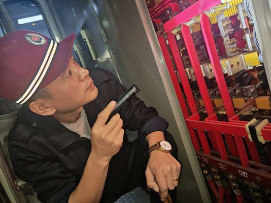 副司机高飞每隔半小时就会钻进机械间进行走廊巡视,及时将机车各部状态详细汇报给蔡家金:“柴油机转速稳定,油位正常,制动管路无异常。”