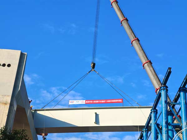 11月23日,在架梁设备的轰鸣声中,中铁十四局狮子洋通道T11合同段施工现场传来捷报——全线60米钢混组合梁首片钢梁顺利安装完成,标志着钢梁安装迈入新阶段,为后续钢梁施工奠定坚实基础。