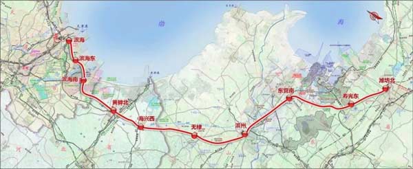 津潍高铁起自天津枢纽滨海站,终至济青高铁潍坊北站,正线长度348.9公里,共设车站10座,设计时速350公里。