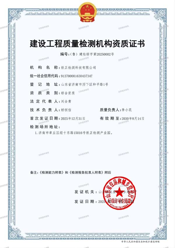近日,山东省住房和城乡建设厅发布《山东省住房和城乡建设厅关于核准2025年度第二十九批建设工程质量检测机构资质名单的公告》。中铁十四局铁正公司成功由专项资质升级为建设工程质量检测机构综合资质,成为山东省第二家获此资质的机构。
